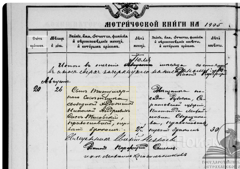 3 - 4. Метрическая запись 1905 г церкви Рождества Богородицы г. Астрахани. (ГААО, Ф 736, Оп 3, Д 95)