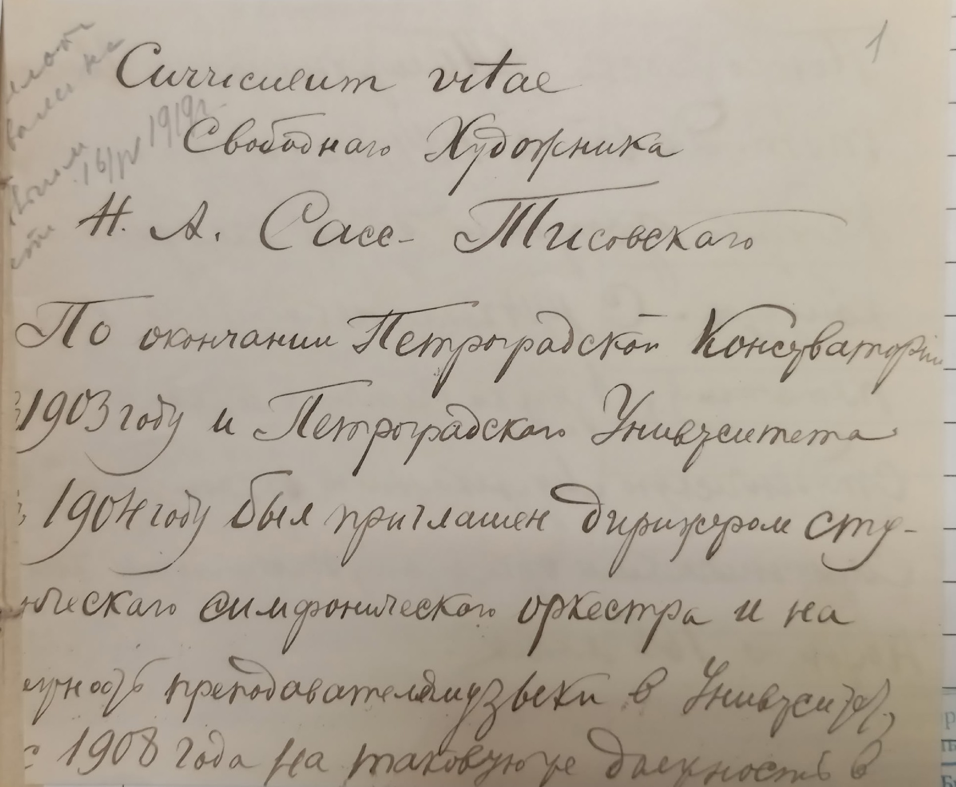 "На основаніи Положенія о д?тскихъ пріютахъ в?домства: Опред?ляется на службу Свободный Художникъ Сассъ-Тисовскій - Почетнымъ Старшиною д?тскаго пріюта Великой Княгини Александры Николаевны, въ С.-Петербург?, съ 7 Сентября. Сенатские ведомости. 1906, выпуск №14".