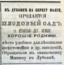 Минин Константин  Александрович (1848–1918) – протоиерей. Владел садом на берегу Волги в 7  десятин, высаженном в 1851 г. Сад состоял из яблонь (500), груш (20), слив  (20), вишен (1000). Яблони и груши рассажены на 3 сажени, и междурядья сплошь  обработаны. Вишенник имеет значительные размеры, и среди него насаждаются  яблоньки и груши. Незначительный питомник содержал до 300 штук саженцев без  всякой формовки. Деревья обмазаны известью и глиной. Орошение производится  посредством чигирей из Волги: два чигиря подают воду друг другу наверх, где она  по желобам и по канавам подводится к лункам. Почва в саду темно-серая,  супесчаная. Сад Минина в 1902 г. сдавался за 1650 руб.